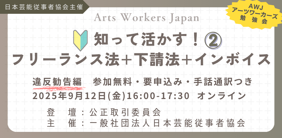 【9/12】「知って活かす!②フリーランス法+下請け法+インボイス勉強会【違反勧告編】」を開催します