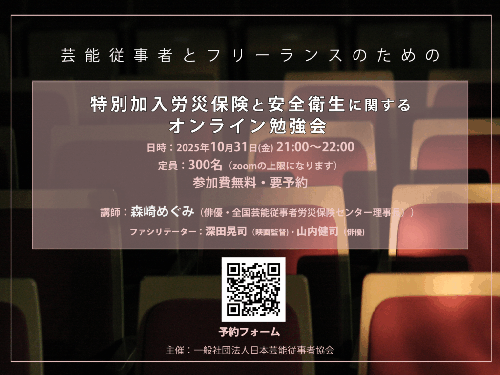 【10/31】「芸能従事者とフリーランスのための特別加入労災と安全衛生の勉強会」を開催します。