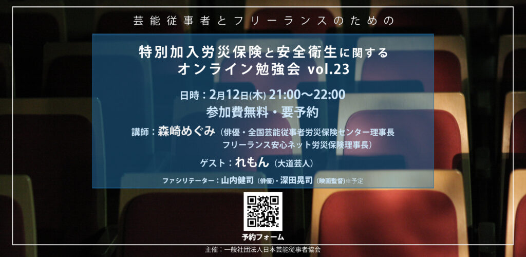 【2/12】第23回「芸能従事者とフリーランスのための特別加入労災保険と安全衛生に関するオンライン勉強会 」開催